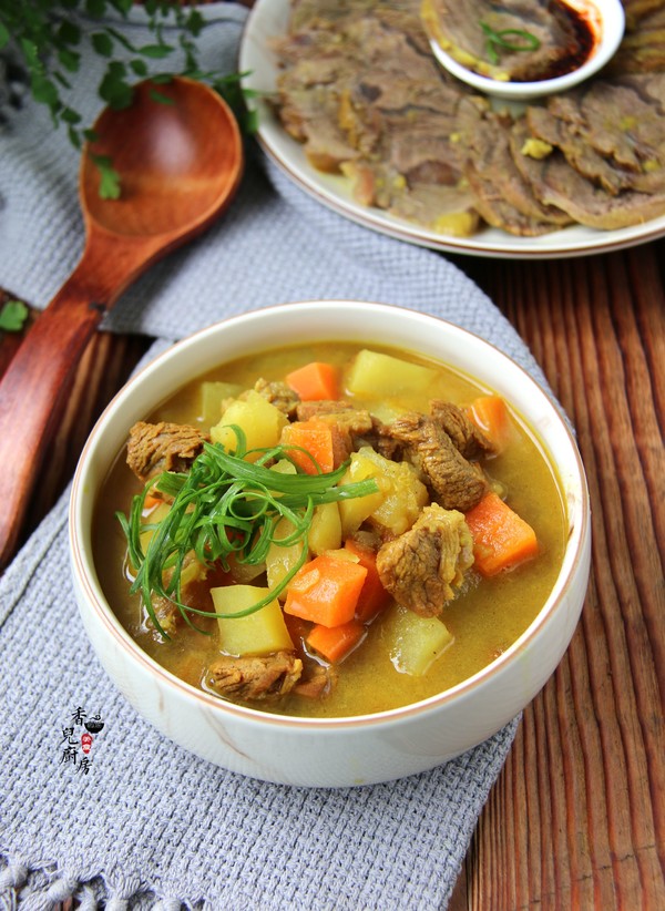 10.咖喱土豆牛肉要趁熱吃,味道最好,拌米飯吃那是小朋友的最愛。大塊的牛肉撈起后等晾涼后再切片,可以蘸咖喱的湯汁,我家喜歡用鮮醬油和自制的油辣椒混合一起當蘸料,味道更棒