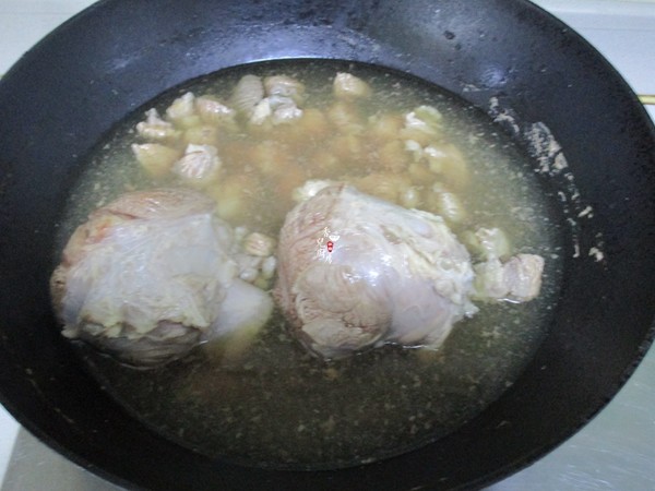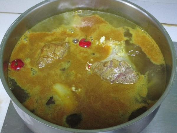 7.加入開水,水量能浸沒牛肉,大火燒開后加蓋轉小火燉約1個半小時