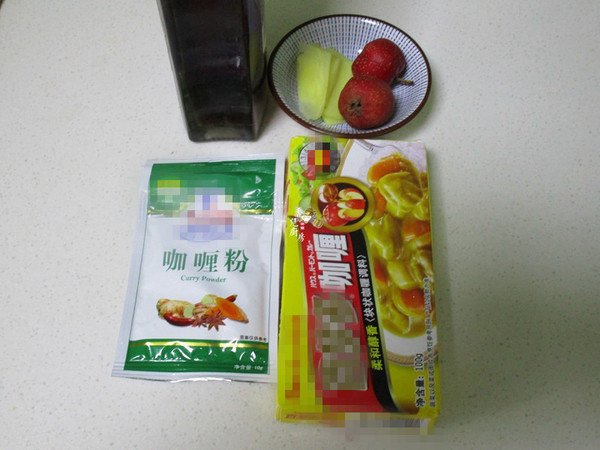 2.備好黃酒,生姜去皮切片,咖喱粉,咖喱塊和鮮山楂,山楂中含量很高的有機酸,可以軟化牛肉纖維,使得牛肉熟得更快,還能解膩。咖喱粉香味更濃郁,咖喱塊能使湯汁濃稠