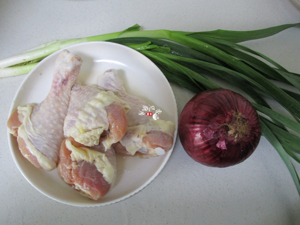 1.雞腿洗凈后瀝干水分,備好洋蔥,大蒜去掉老葉和根洗凈