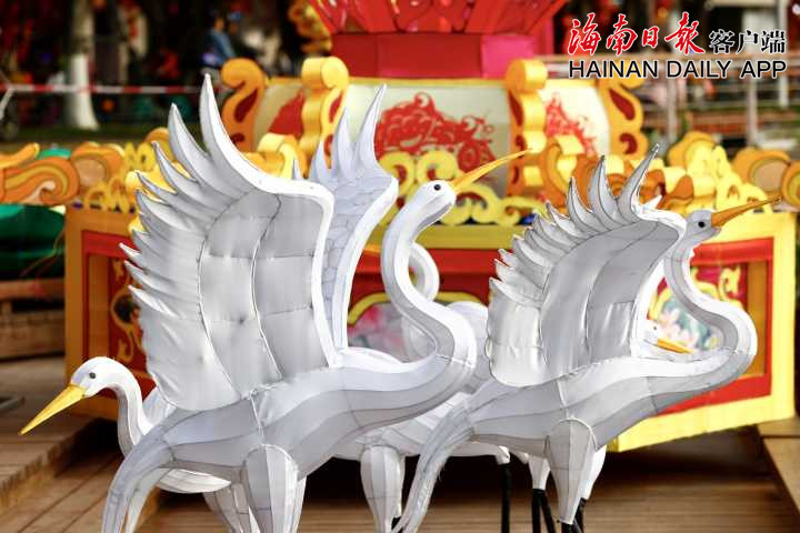 12月26日,記者在海口三角池公園看到,各色精美花燈在東湖畔有序擺放,工人在做造型拼接和通電施工。海南日?qǐng)?bào)客戶(hù)端記者陳若龍 攝
