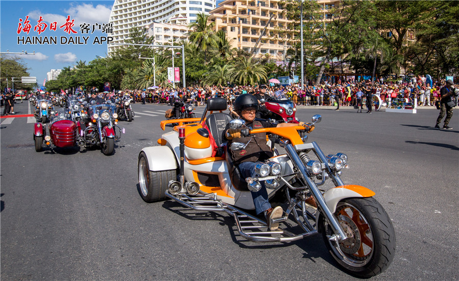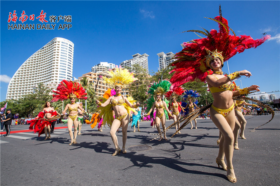 緊隨其后,志愿者方陣、青春街舞方陣、炫動三亞花車與絲路情長花車方陣、吉祥人偶方陣、黎族苗族舞方陣、電音章魚花車與重型機車方陣陸續出場,沿著三亞灣從海月廣場一路走向鳳凰島入口。