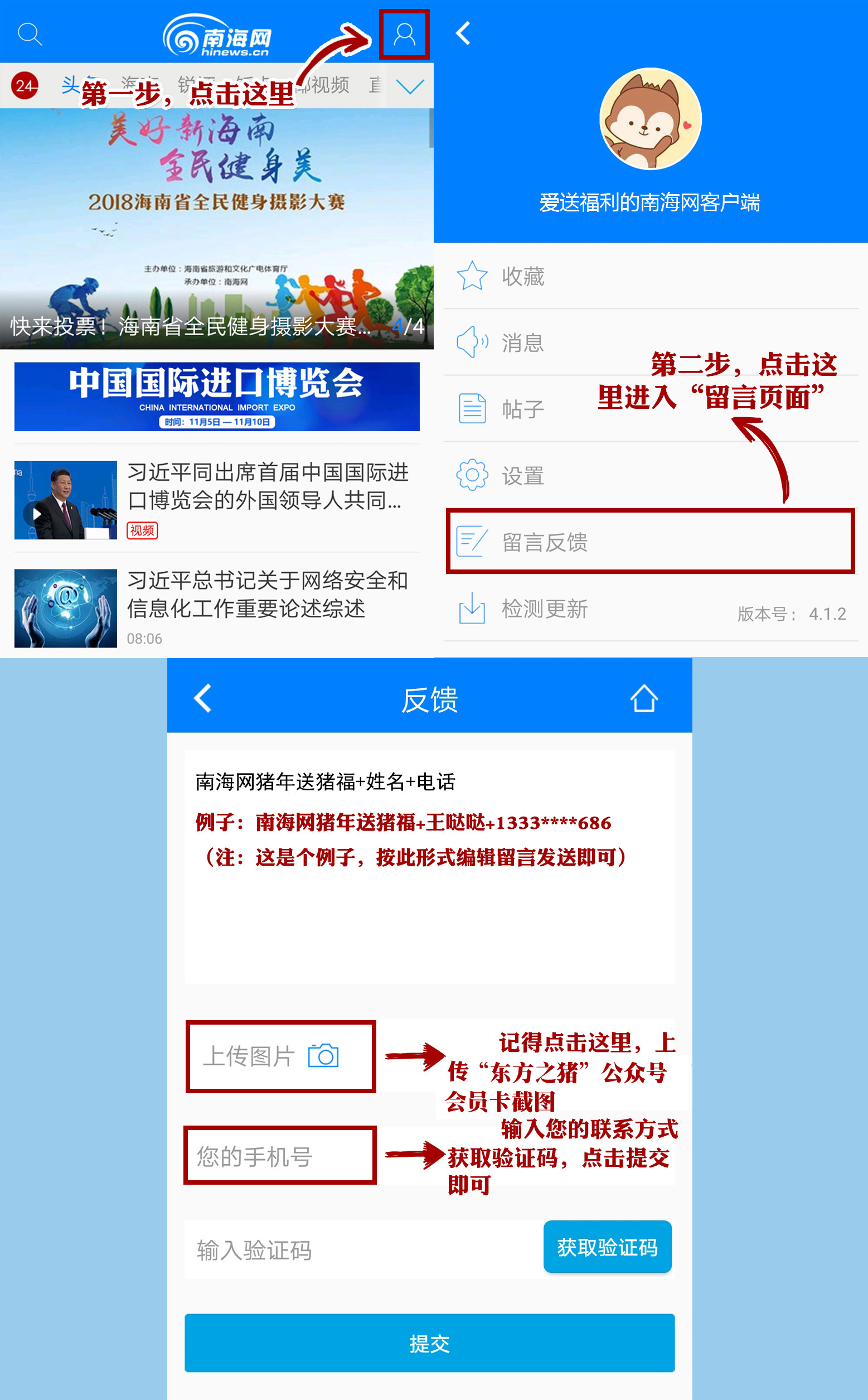 點擊右上角,按步驟操作。將公眾號會員卡截圖并注明“南海網豬年送祝福+名字+手機號碼”,發送至客戶端。