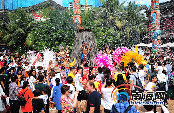 1月29日中午,三亞千古情景區漫天“飛雪”,吸引了眾多的中外游客身著夏裝在“雪”中嬉戲。 南海網記者 沙曉峰 攝