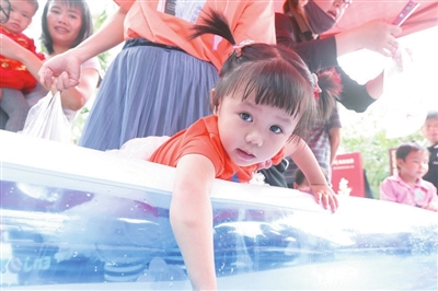 三亞美麗鄉村中廖村,一名小女孩正在參加開心捉魚活動。