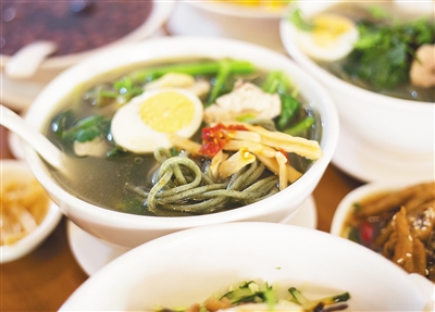 市場上,琳瑯滿目的雞屎藤產品有許多,怎樣做出特色、做出創新,就成了她考慮的重點。“人們吃東西越來越講究健康。” 羊蓮菲說,受蔬菜面條的啟發,她想到了做雞屎藤面。經過反復實驗,她發現用曬干的雞屎藤和面,能很大程度上去掉雞屎藤的腥味。對于配料、高湯她也反復嘗試,達到售賣標準。