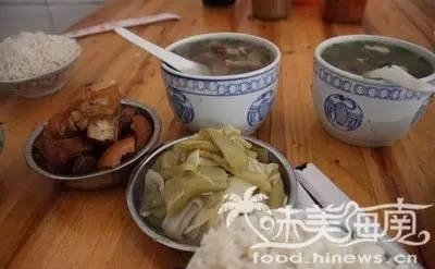 在海南吃海南粉你得曉得“一碗兩吃”。一吃:加了醬汁的海南粉攪拌平均,開吃。二吃:吃一半后加入海白湯海螺湯的鮮 醬汁的甜 粉的酸混淆出的滋味,完滿。