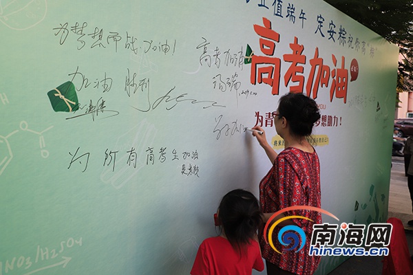 市民在高考加油的簽名墻上留下對高考學(xué)子的祝福語。南海網(wǎng)記者 黃祥 攝