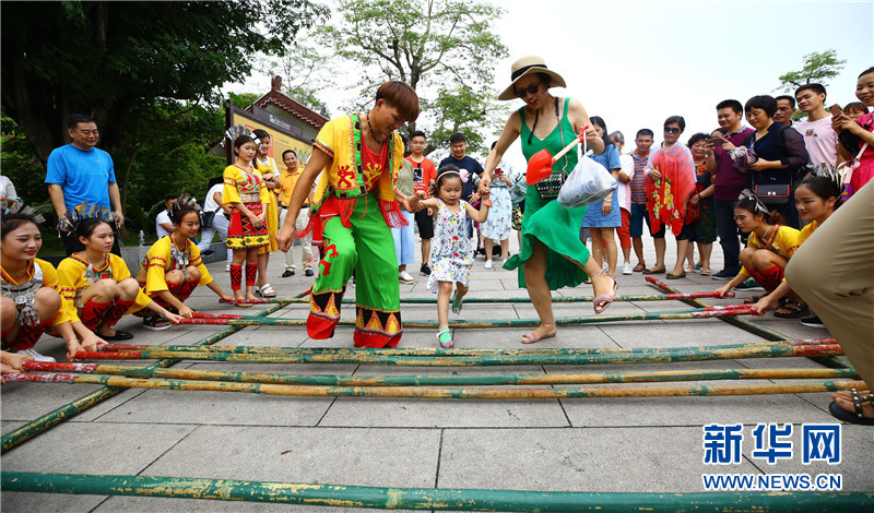 資料圖:端午假期,家長帶孩子在南山景區和演員跳竹竿舞。新華網發