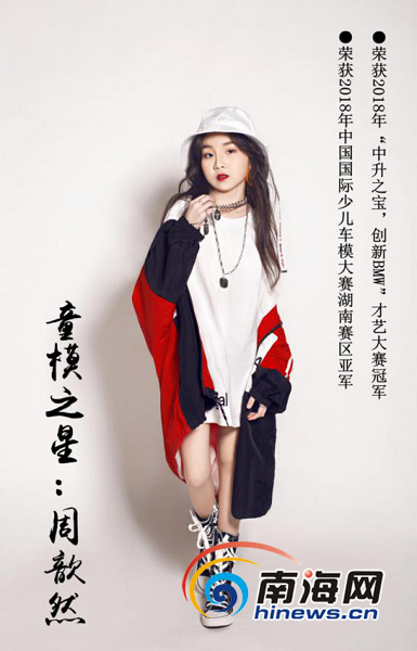 周歆然,10歲,身高136cm。一個偶然的機會,孩子被模特學校的老師看中,經過幾個月的學習,孩子的走姿、氣質、樂感等都有很大的進步,陸續參加了一些比賽,都取得了優異的成績,比如“中升寶馬大賽”冠軍、“國際車模大賽”亞軍……后被邀約參加了一些時裝新品發布會、攝影機構的平面拍攝、“母親節宣傳片”、電視劇頻道24集情景劇等拍攝活動。