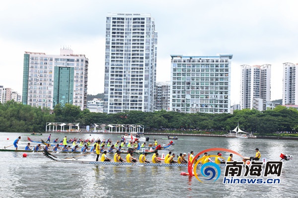 來自各行各業(yè)的15支隊伍在三亞河上龍舟競渡。南海網(wǎng)記者 劉麗萍 攝