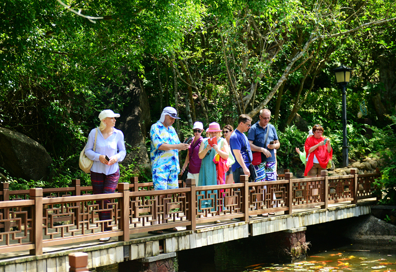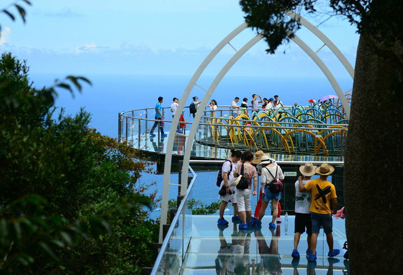 隨著仲夏時節到來,天氣較為炎熱,熱帶雨林中的涼爽環境受到中外游客的青睞。端午節當天,不少市民游客在蘭花谷納涼賞花。而景區中的過江龍索橋、大佛石全海景玻璃棧橋、滄海樓、婚禮廣場等景點,不僅海風習習,更可觀碧海藍天的美景,吸引眾多游客紛紛拍照留念。