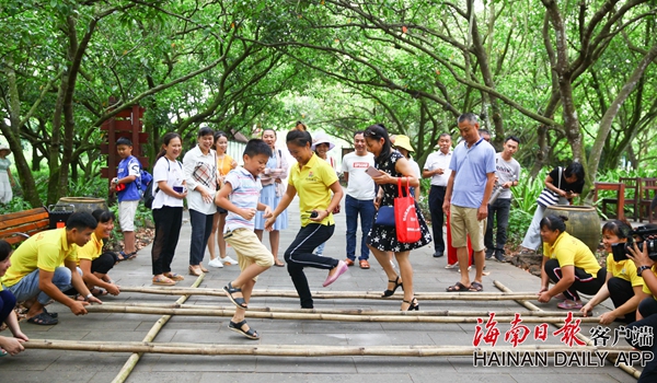 2019年7月18日,在海口馮塘綠園,游客在開心跳竹竿舞。海南日報記者張茂 攝