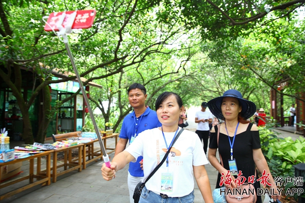 2019年7月18日,在海口馮塘綠園,游客在橄欖樹下開心合影。海南日報記者張茂 攝