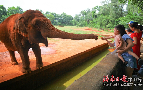2019年7月18日,在海南熱帶野生動植物園,游客在給大象喂食。海南日報記者張茂 攝