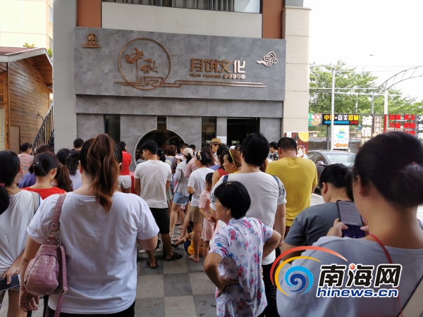 當天一大早,海口水晶宮酒樓旁已圍滿顧客。他們排著隊領到了自己早早預定的月餅,也有人在現場看到了金黃可口的月餅,忍不住往購物袋里添了幾盒。