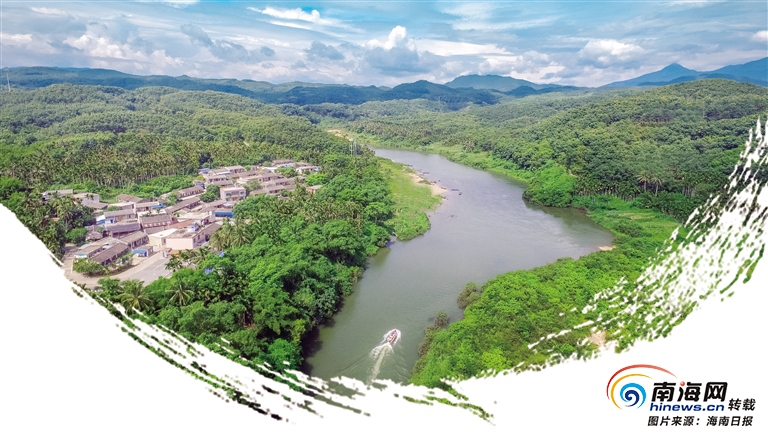 俯瞰萬泉河瓊海段,天藍水清,兩岸綠樹蔥蘢。