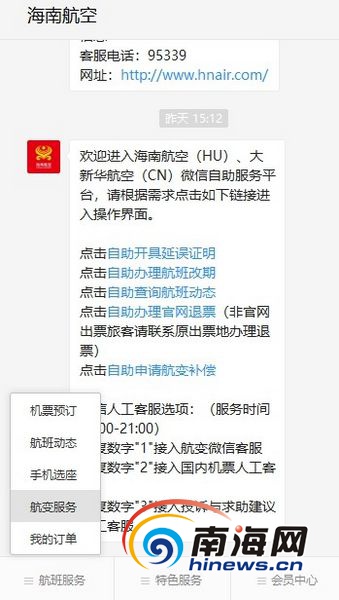 海南航空微信公眾號-菜單-自助補償獲取渠道。海南航空供圖