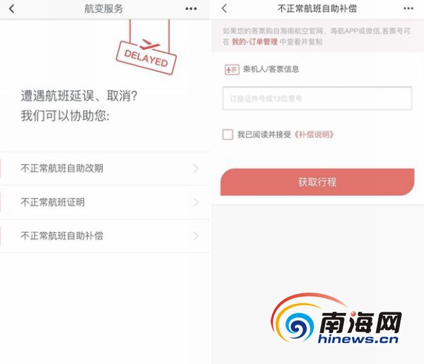 海南航空App-首頁-航變服務-自助補償獲取渠道。海南航空供圖