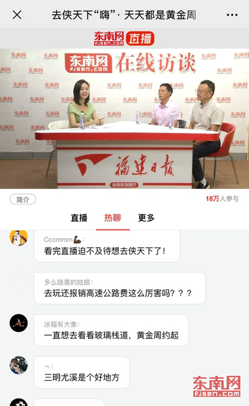 東南網訊(記者田燕平)8月22日上午,福建俠天下景區創辦人、董事長池昭穩和俠天下首席文化顧問孟毅成做客東南網演播廳接受記者采訪,并發布消息:“即日起至10月7日止,凡自駕來俠天下旅游者,均報銷高速過路費”。本次在線訪談東南網采取網絡直播形式,現場觀看這場網絡直播的人數達到18萬人,發布的“去俠天下嗨,天天都過黃金周”的消息引發網友熱議。