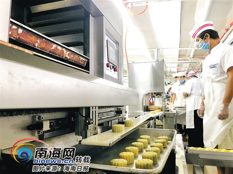 瓊海昌隆酒店已經流水線生產雞屎藤和班蘭口味的月餅。袁宇 攝