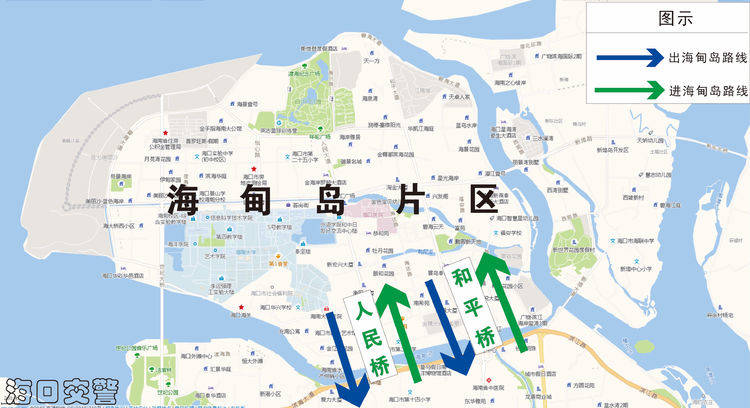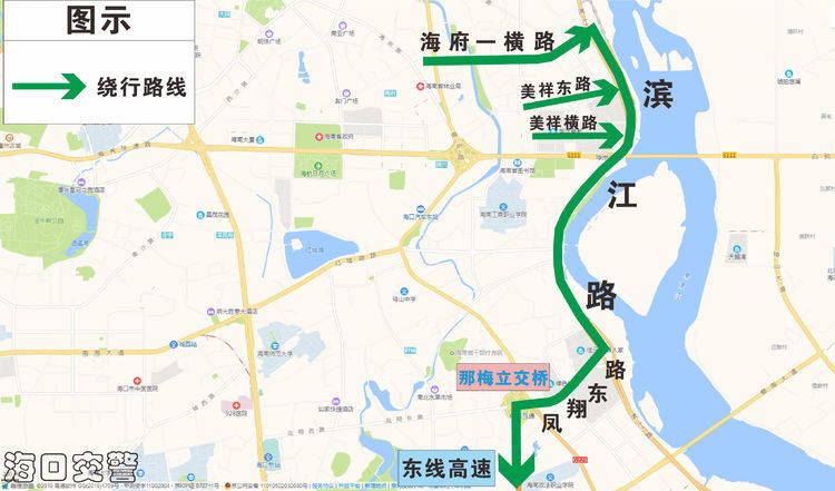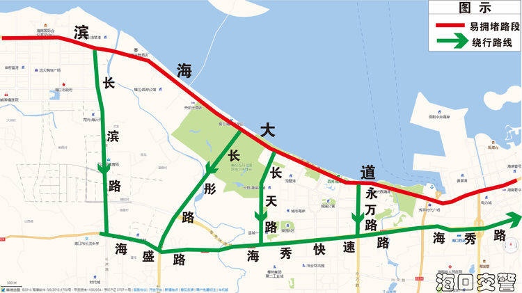 (二)可從海府一橫路延長線、美祥東路、美祥橫路上濱江路、鳳翔東路前往東線高速,盡量避開龍昆南路→迎賓大道、海府路→瓊州大道出城壓力集中的道路;