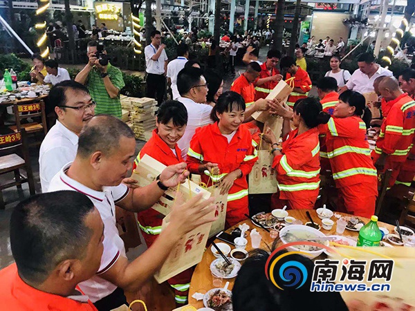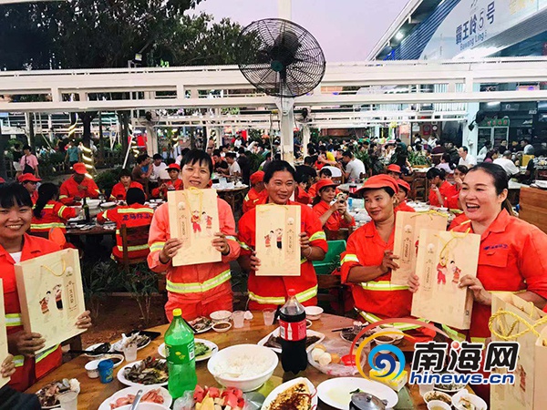 現(xiàn)場(chǎng)環(huán)衛(wèi)工人獲贈(zèng)月餅。南海網(wǎng)見(jiàn)習(xí)記者 鐘瑜 攝