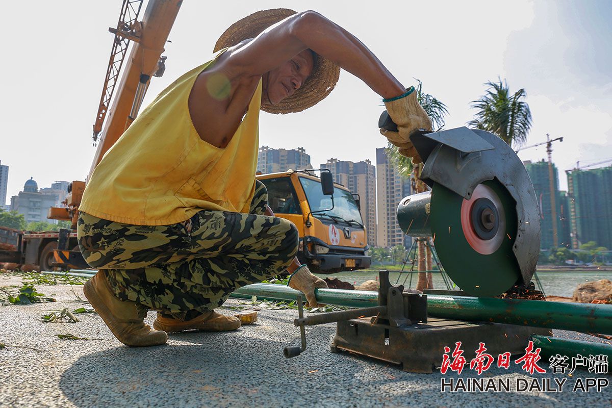 9月15日,在海口紅城湖公園南岸工地,工人切用于加固樹木的鋼管。海南日報見習記者 李天平 攝
