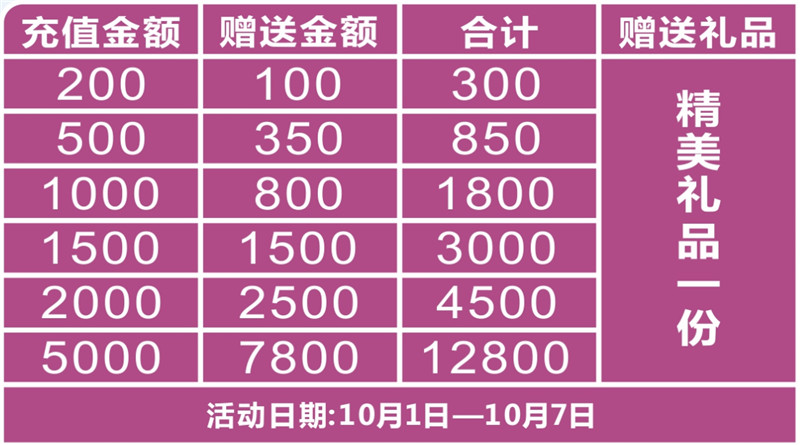 10月1日至3日,凡在億恒夜市服務中心辦理充值卡,即享充值100元送10元,以此類推無上限;(注:億恒夜市充值卡起充金額為100元。)