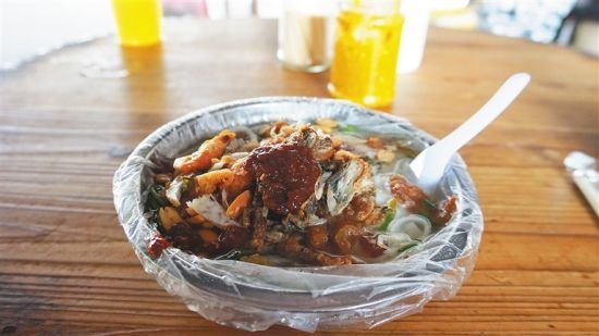 到海南旅游請別忘品嘗一下既地道又實惠的海南粉。其吃法有點類似北方人的“涼拌”,海南人叫“腌粉”,即在制好的米粉上加上鹵汁、油炸花生米、炒芝麻、豆芽、蔥花、肉絲、香油、酸菜、香菜等。正因為海南粉的細,所拌的料才能入味,經拌勻后其味醇香撲鼻,余味無窮。吃后再加上一勺用海螺煮的海螺清湯,更是鮮香無比。