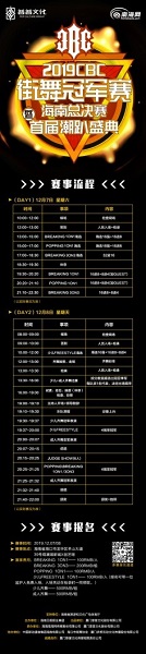 據(jù)介紹,CBC街舞冠軍賽從2010年第一屆CBC全球華人街舞冠軍賽至今,一直都是中國街舞的頂級交流平臺,不論是規(guī)模還是規(guī)格上都達(dá)到了世界頂尖水平。2019CBC街舞冠軍賽海南總決賽面向全國街舞愛好者進(jìn)行征集,賽事為期兩天。賽事項目包括BREAKING(1V1、3V3)海選、POPPING(1V1)海選、少兒freestyle海選、齊舞賽(少兒、成年),選手們將通過一次次舞力對決,用干凈利落的舞蹈動作和變幻莫測的舞步釋放青春正能量,炸翻全場。