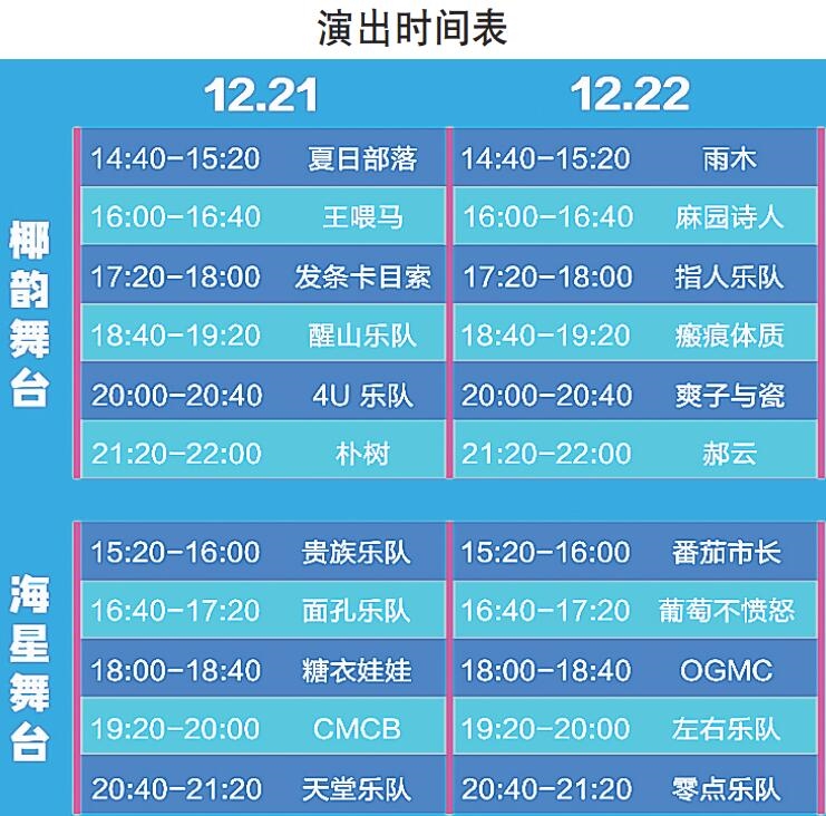 據(jù)介紹,參加此次音樂節(jié)的22組國內(nèi)知名音樂人的演出時間已公布,12月21日演出的有夏日部落、王喂馬、發(fā)條卡目索、醒山樂隊、4U樂隊、樸樹、貴族樂隊、面孔樂隊、糖衣娃娃、CMCB、天堂樂隊等。12月22日演出的有雨木、麻園詩人、指人樂隊、瘢痕體質(zhì)、爽子與瓷、郝云、番茄市長、葡萄不憤怒、OGMC、左右樂隊、零點樂隊等。樂迷可根據(jù)自己的購票情況,在對應時間里為自己喜愛的歌手和樂隊喝彩。
