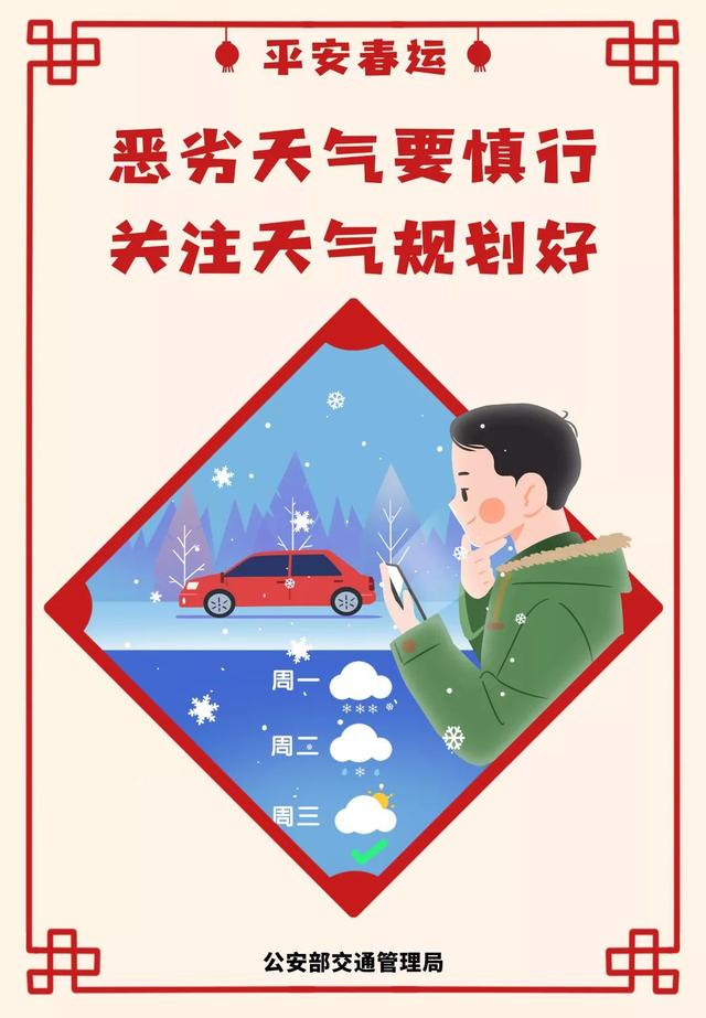關注路況信息。春運期間交通流量大,出行前要提前規劃好路線,要通過地圖導航、交通廣播、電視、公安交警微博、公眾號、短信平臺等渠道及時掌握路況信息、管制情況,錯峰出行,避開擁堵路段。
