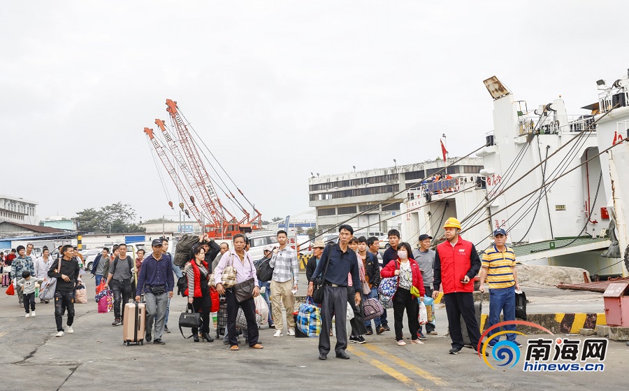 1月10日上午,春運首日,海口秀英港碼頭內,旅客準備登上瓊州海峽紫荊十二號客滾船。南海網記者 李昊 攝