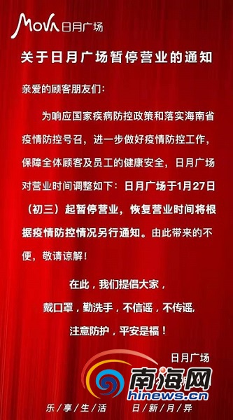 海南旅游頭條、南海網(wǎng)、南海網(wǎng)客戶端???月27日消息(南海網(wǎng)記者 蘇靚)1月27日,記者從海口日月廣場獲悉,為防控疫情,從即日起,日月廣場暫停營業(yè),恢復(fù)營業(yè)時間將根據(jù)疫情防控情況另行通知。