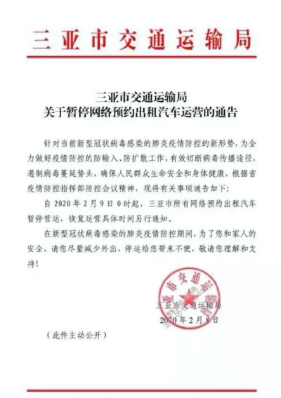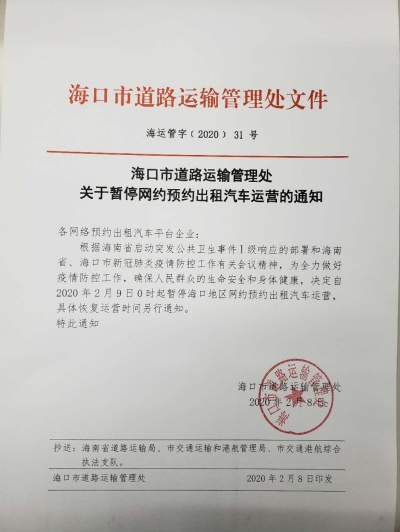 2月8日,海口市道路運輸管理處發布通知,決定自2月9日0時起暫停海口地區網約車運營,恢復時間另行通知。同天,三亞市交通運輸局發布《關于暫停網絡預約出租汽車運營的通告》。通告指出,自2020年2月9日0時起,三亞市所有網約車暫停運營,恢復運營具體時間另行通知。