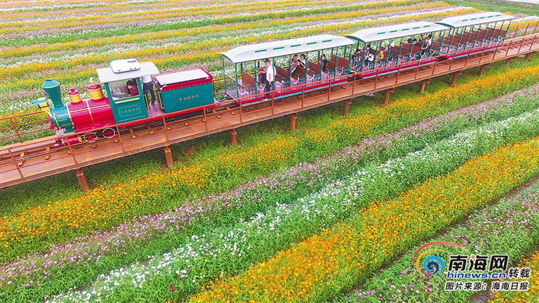 近日,游客在瓊海市嘉積鎮龍壽洋萬畝田野公園乘小火車觀光。蒙鐘德 供圖