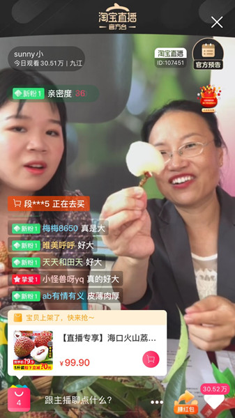 ??谵r業農村局局長陳芳在淘寶直播推介海口火山荔枝王。淘寶供圖