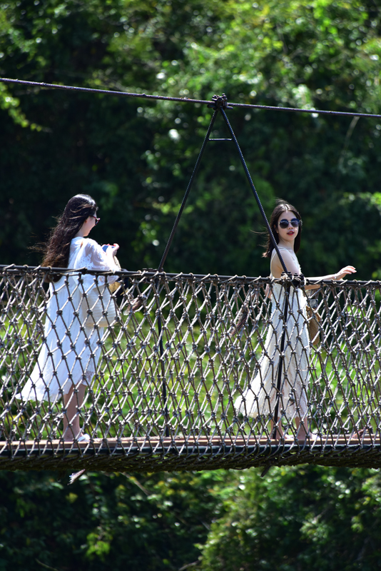 5月15日,炎炎夏日,游客在三亞亞龍灣熱帶天堂森林旅游區避暑納涼,體驗熱帶雨林清涼之旅的景象。(黃慶優攝)