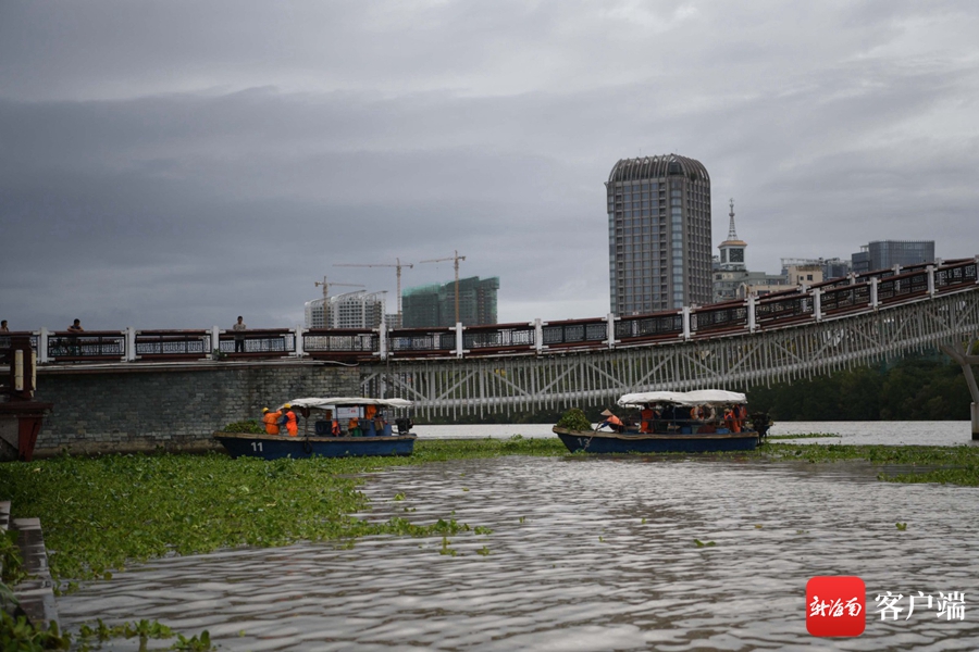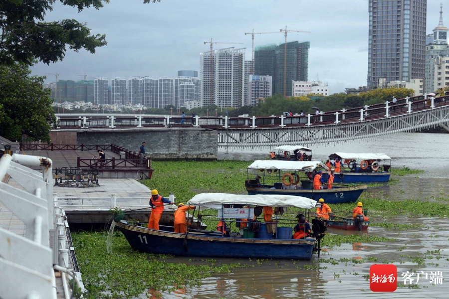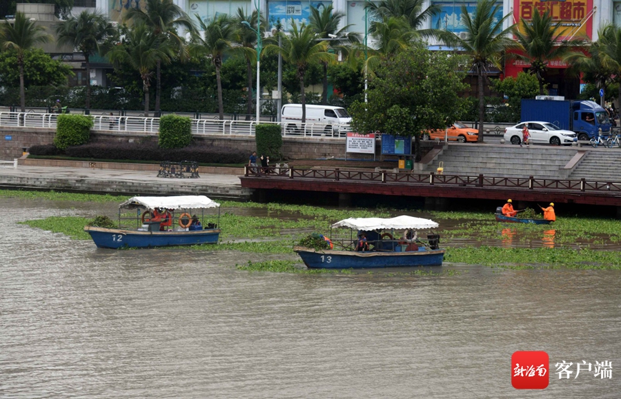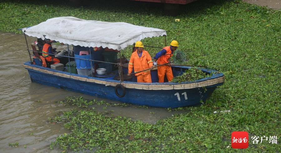 6月17日,工作人員在三亞河畔打撈水浮蓮。記者 沙曉峰 攝