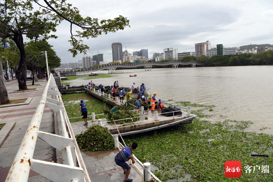 新海南客戶端、南海網、南國都市報6月17日消息 (記者 沙曉峰)6月17日,工作人員和志愿者在三亞河畔打撈水浮蓮。