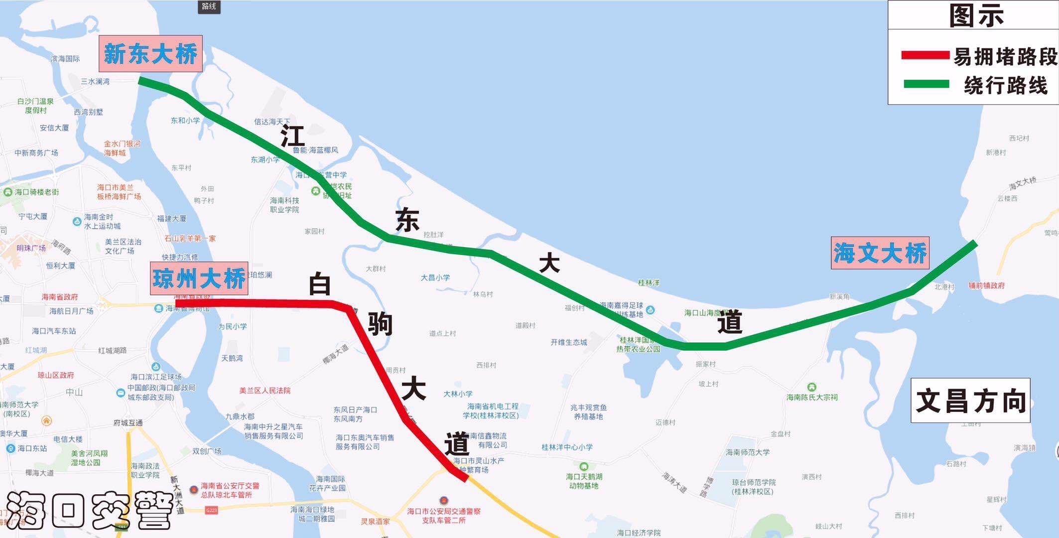 (1)瓊州大道北片區(如海甸島、國貿區域)駕駛人可取道新東大橋往東行駛前往江東大道出城。