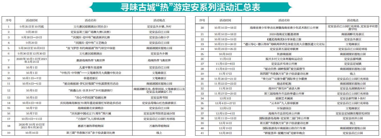 這些活動(dòng)中,既有足球聯(lián)賽、皮劃艇邀請(qǐng)賽、乒乓球公開賽、國際拳王爭霸賽等體育活動(dòng),也有邀請(qǐng)游客分享定安美食美景、勵(lì)志彩虹跑、環(huán)保游園會(huì)、瓊劇名家演唱會(huì)等,屆時(shí)歡迎各地游客到定安體驗(yàn)。