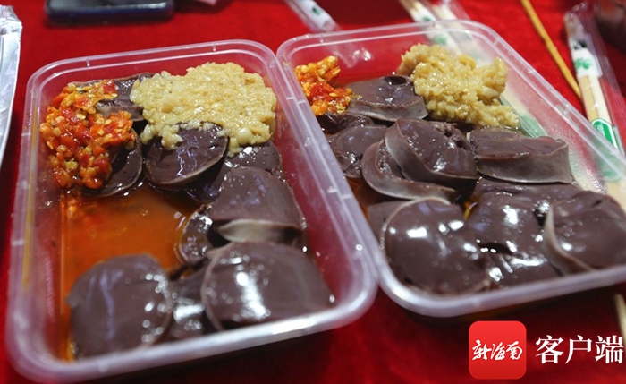 海口福地美食街內御膳壇子雞店的豬血腸。記者 陳望 攝