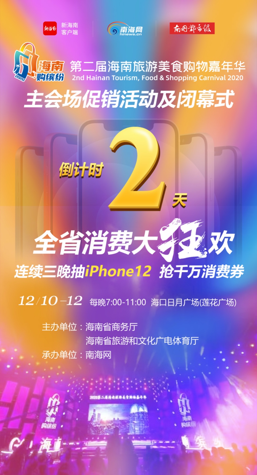 新海南客戶端、南海網(wǎng)、南國都市報12月8日消息(記者 韓星)還記得11月13日晚的那場購物促銷大狂歡嗎?4部iPhone12免費抽,千萬消費券大派送的火熱場景為現(xiàn)場觀眾帶來一場福利盛宴。現(xiàn)在,這場狂送好禮的促銷活動又來了!2020第二屆海南旅游美食購物嘉年華(下稱嘉年華)兩場主會場促銷活動和閉幕式將于12月10日至12日每晚7時在海口日月廣場舉行,市民游客期待的iPhone12、消費券、商家福利、精彩節(jié)目全都有!