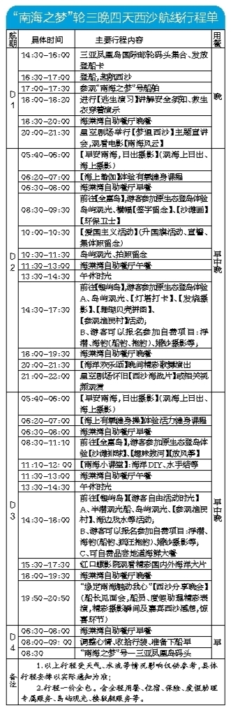 據(jù)了解,目前復(fù)航的西沙旅游航線行程為4天3晚。根據(jù)客艙房型的不同,“南海之夢”輪艙位價(jià)格為4880-26800元。配套有生活區(qū)域和娛樂區(qū)域,包含房間、餐廳、書店以及電影院等。行程圍繞全富島、銀嶼島進(jìn)行登島觀光活動(dòng),領(lǐng)略西沙的純凈之美。期間有南海西沙知識講座、專業(yè)演藝團(tuán)隊(duì)表演以及漁家民俗體驗(yàn)等特色活動(dòng)。