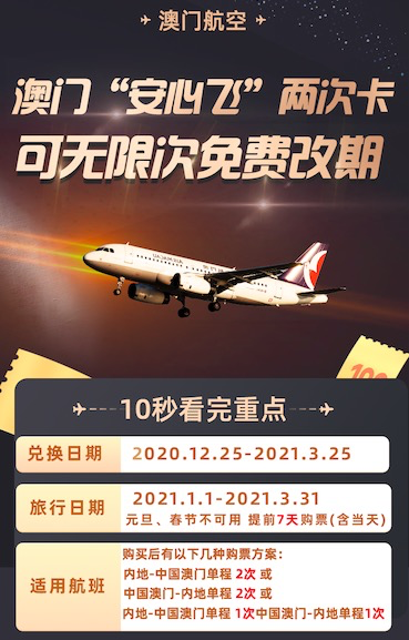 今年9月,飛豬聯合澳門航空等共同推出機票“買一送一”的超值優惠。為了迎接即將到來的跨年旅游旺季,澳門航空在此前優惠基礎上,又疊加推出了折上立減活動,游客可用19.9元購買價值220元的紅包,享受雙重優惠。為適應不同客群的需求,澳門航空還在飛豬上推出590元和990元的“安心飛”兩次卡,兩款產品對應不同的航線并不限乘機人,游客可單人飛兩次,用來預約任意兩個單程的澳門航空航班;也可情侶或閨蜜相約出行,2個人用一次單程,將極大方便內地游客赴澳旅行。