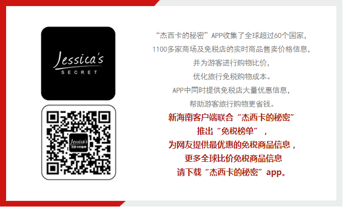 基于全球比價APP“杰西卡的秘密”百萬用戶周期內(nèi)點擊熱門商品排名,新海南聯(lián)合“杰西卡的秘密”推出“最受關(guān)注免稅品榜單”,在未來的日子里,將會以“周榜單”和“月榜單”和大家見面~