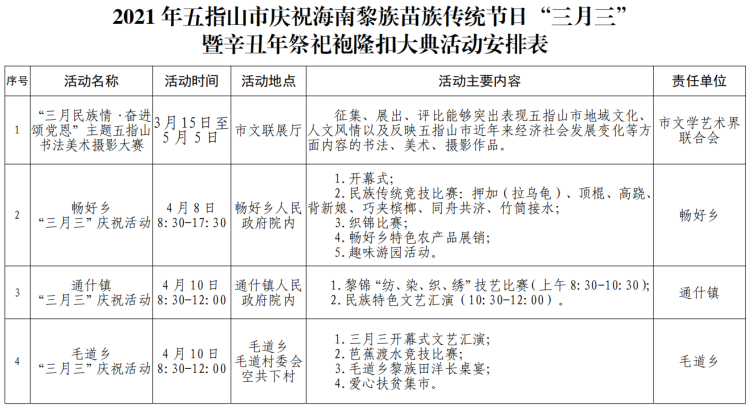 新海南客戶端、南海網、南國都市報3月24日消息(記者 石祖波)農歷三月三即將來臨,2021年“黎族苗族傳統(tǒng)節(jié)日三月三”系列活動暨辛丑年祭祀袍隆扣大典將上演。記者從五指山市相關部門獲悉,今年農歷三月三,五指山市將舉辦辛丑年祭祀袍隆扣大典、文藝晚會等系列活動。此外,五指山市各鄉(xiāng)鎮(zhèn)也將舉辦趣味民俗活動、海南民歌暨竹木器樂比賽等活動,迎接廣大市民游客到來。