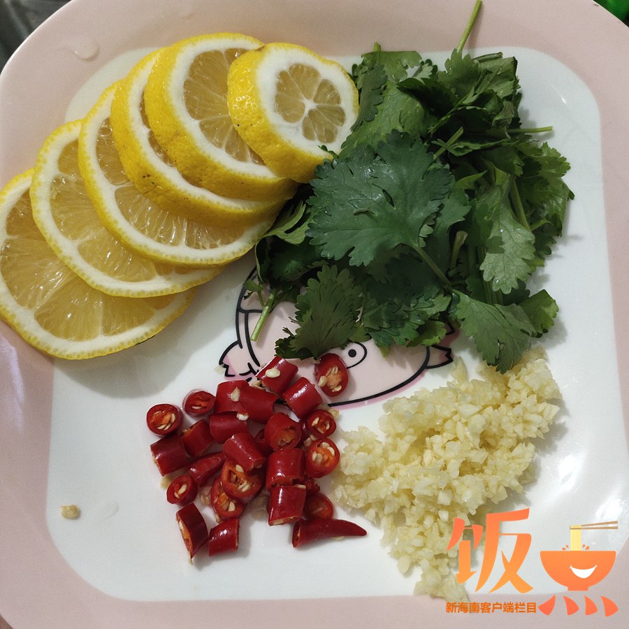 3、雞爪浸泡的過程中,準(zhǔn)備一下配料:切蒜粒、小米椒切小段、香菜切小段、檸檬切片,把籽挑出來